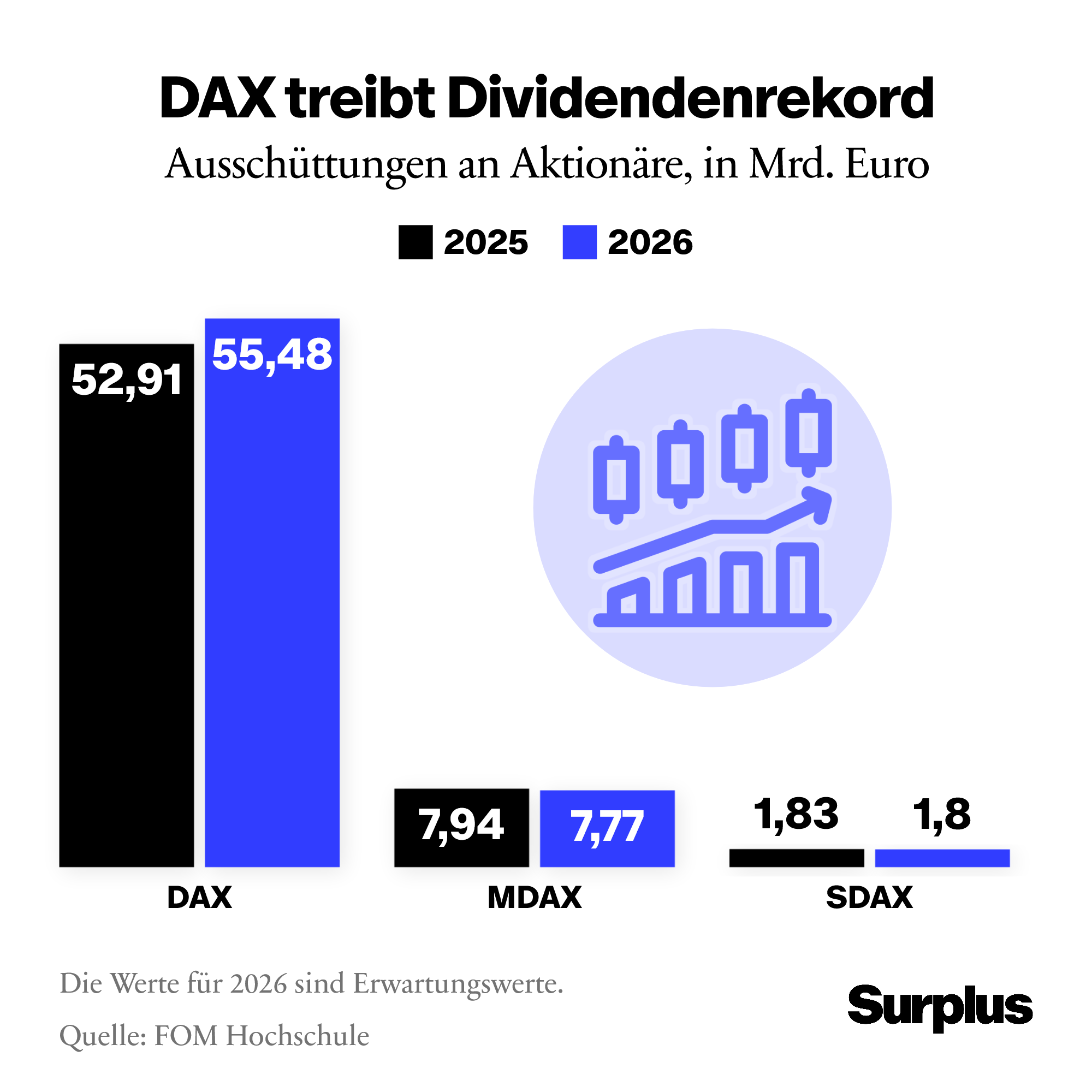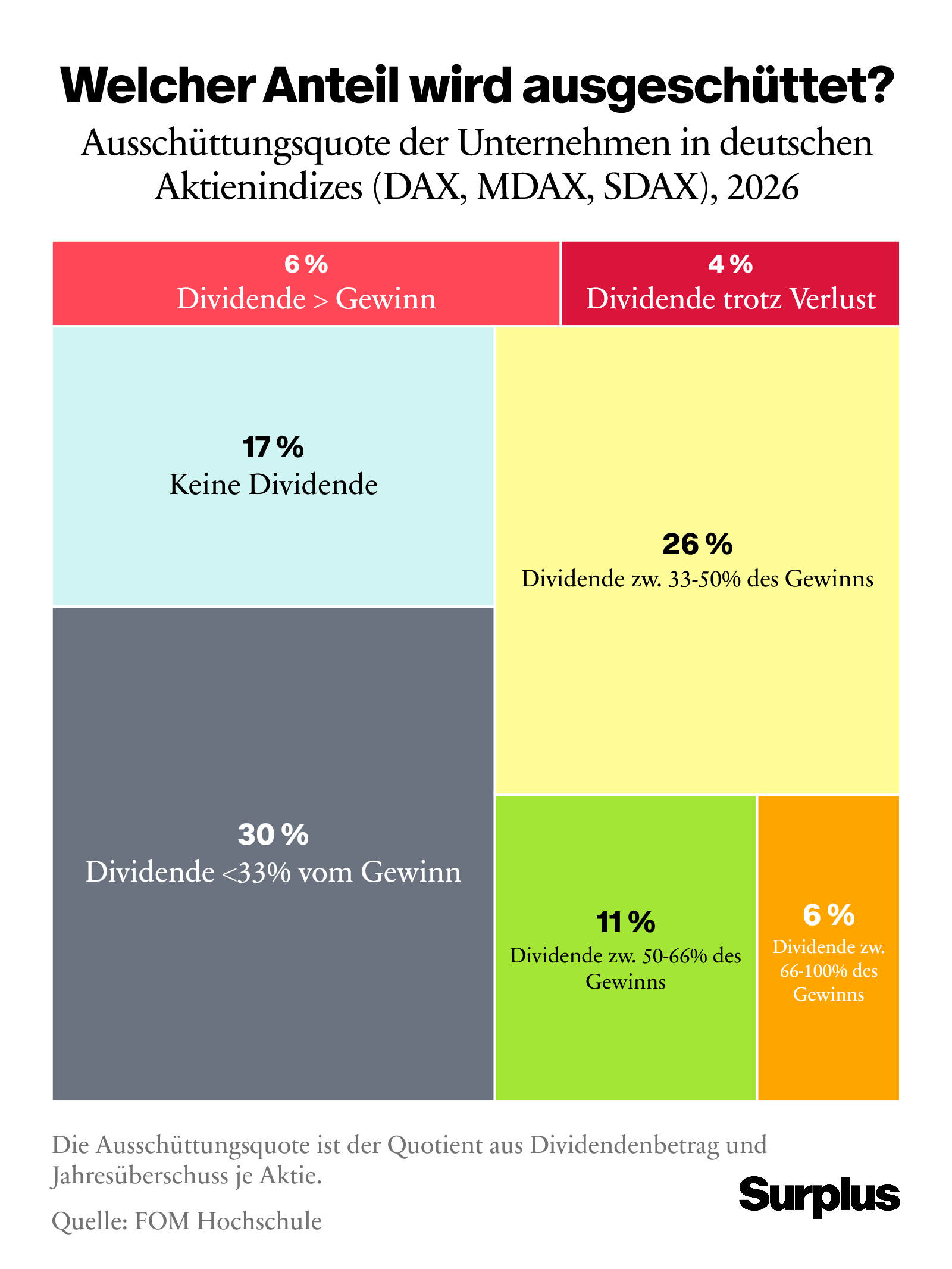Die 160 öffentlich gelisteten Unternehmen in deutschen Aktienindizes (DAX, MDAX, SDAX) werden dieses Jahr rund 65 Milliarden Euro Dividenden an ihre Aktionäre auszahlen. Das sind der am gestrigen Montag vorgestellten Dividendenstudie 2026 der FOM Hochschule zufolge 3,8 Prozent mehr als im Vorjahr und somit ein neuer Rekordwert. Insgesamt schütteten demnach 83 Prozent aller gelisteten Werte Dividenden aus.