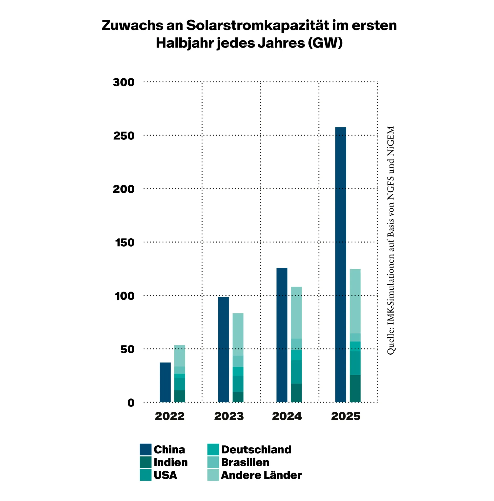 Bei aller Aufregung um Chinas neue Elektrofahrzeuge ist es der Bereich der Infrastruktur, in dem Chinas grüne Revolution am beeindruckendsten ist. Bekanntlich dominiert China die Lieferketten für alles, von Seltenen Erden über Batterien bis hin zu Windkraftanlagen. Aber es sind die Wachstumsraten seit 2020, die wirklich atemberaubend sind. In den ersten sechs Monaten des Jahres 2025 installierte China 256 Gigawatt (GW) Solarenergie. Ja, Sie haben richtig gelesen. Das ist mehr als doppelt so viel wie die gesamte installierte Solarenergiekapazität Deutschlands – in einem Land, in neuen Anlagen, in sechs Monaten. Chinas neue Solarinstallationen in der ersten Hälfte des Jahres 2025 waren mehr als doppelt so hoch wie die der restlichen Welt zusammen. Die nächsten »Konkurrenten« waren Indien und die USA mit jeweils 24 GW und 21 GW, also weniger als einem Zehntel.