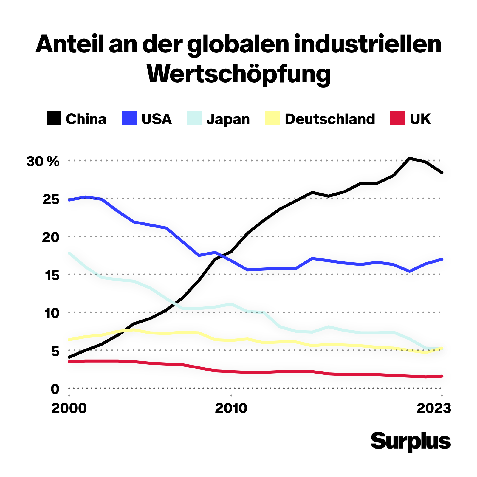 Das trieb die Investitionen im Land weiter hoch: 2015/16 lagen sie noch bei 4,7 Billionen US-Dollar, im Jahr 2024 bei knapp 7,5 Billionen US-Dollar. Im Inland investierten und investieren chinesische Konzerne Milliarden in Fabriken, Rohstoffe, Energieträger und Arbeitskräfte, um sich in brutalen Preiskämpfen Marktanteile abzuringen, während gleichzeitig die hohen Überkapazitäten in den globalen Markt gedrückt werden. Das hat zur Folge, dass europäische und US-amerikanische Konzerne sowohl in China als auch international Marktanteile verloren haben und deren Profite eingebrochen sind. Das wichtigste Beispiel ist hier wohl die Automobilindustrie. Während private Konzerne wie BYD aktuell zum weltgrößten Produzenten für E-Autos aufsteigen, brechen bei Porsche und VW die Zahlen ein.
