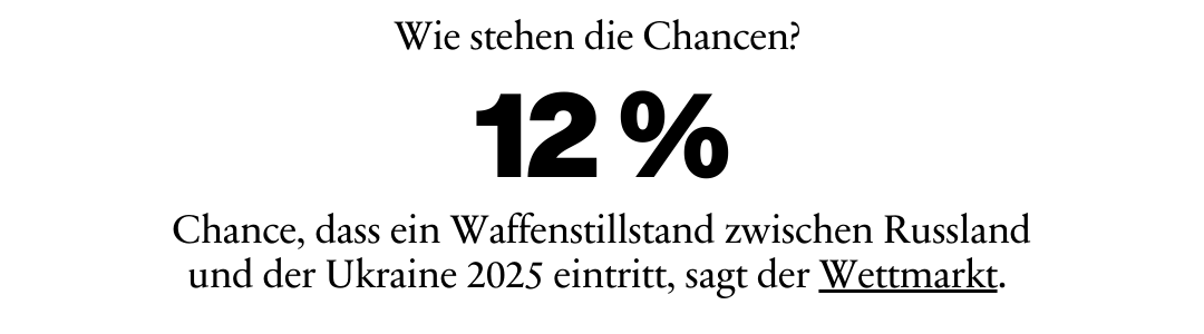- Eine Nutzung Russlands eingefrorener Gelder: 100 Milliarden für den Wiederaufbau der Ukraine, die USA erhalten 50 Prozent der Gewinne aus diesen Unternehmen, die restlichen Gelder werden in ein amerikanisch-russisches Investitionsinstrument investiert, die eingefrorenen europäischen Gelder werden freigegeben.