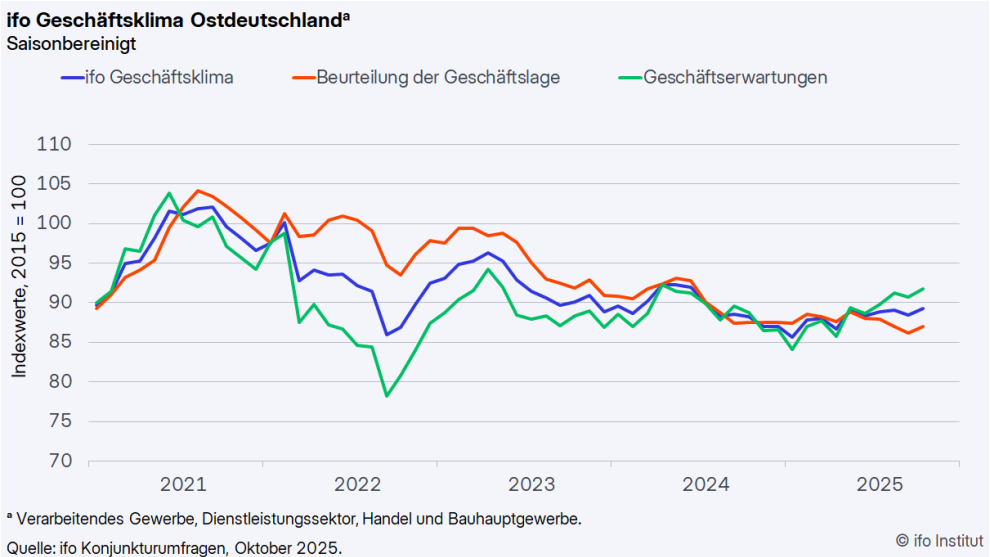 Regelmäßig kommen in diesen Wochenbrief das Geschäfts- und das Konsumklima vor – doch nur für Gesamtdeutschland. Ein Grund mehr, sich dieses Mal anzusehen, wie es in Ostdeutschland läuft. Denn das Ifo-Institut gibt auch regelmäßig einen Geschäftsklimaindex für den Osten heraus, der auf 1200 Meldungen von Unternehmen des Verarbeitenden Gewerbes, des Bauhauptgewerbes, sowie des Groß- und Einzelhandels basiert.