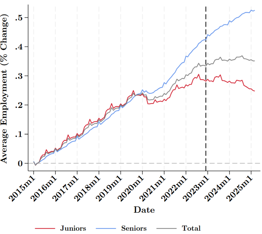 Eine Erklärung ist vor allem in den Medien schnell gefunden: Künstliche Intelligenz (KI). In den USA und Großbritannien, wo die Integration von KI in Betriebsabläufe weiter vorangeschritten ist, wurde bereits die »Jobpokalypse« ausgerufen. Gerade die oft einfachen und repetitiven Tätigkeiten von Einsteigern ließen sich weitgehend automatisieren und würden zum Wegfall dieser Stellen führen. Eine Studie von Forschern der Universität Harvard auf der Grundlage von Millionen Stellenanzeigen über 10 Jahre in den USA konstatiert bei der Einführung von KI einen »technologischen Wandel zugunsten der Seniorität im Betrieb.« Das führe dazu, dass die »unteren Stufen der internen Karriereleiter schmaler werden.«