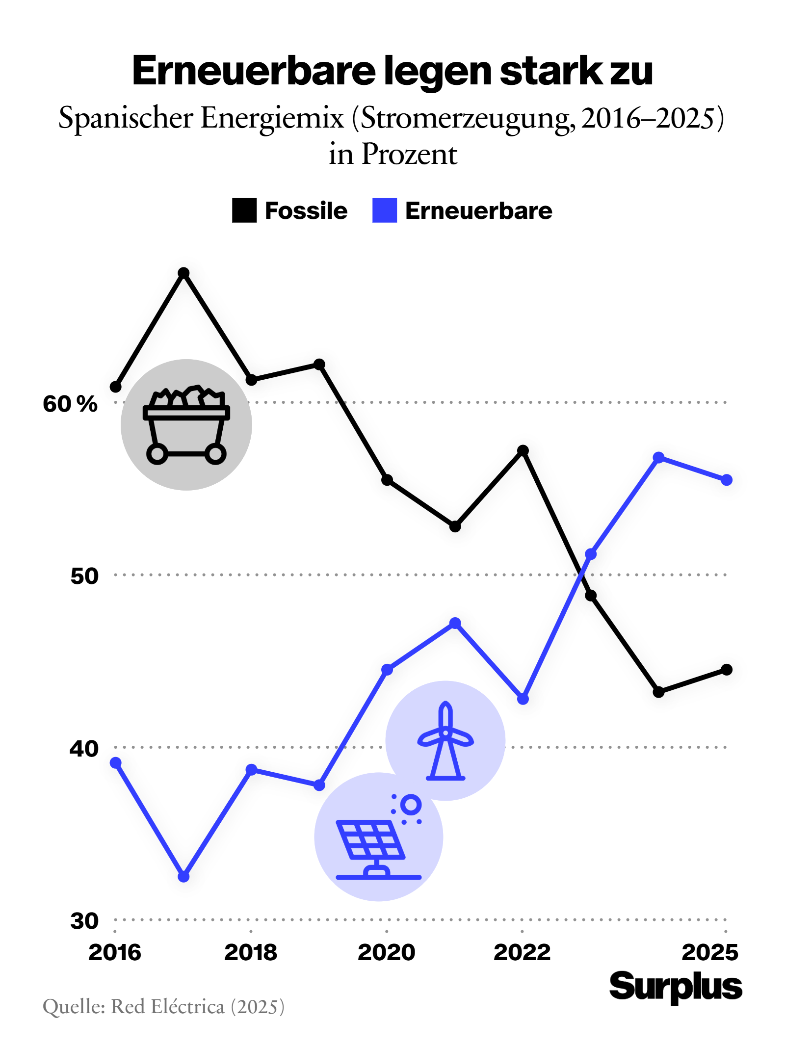 In den letzten zehn Jahren hat Spanien massiv in Windkraft und vor allem in Photovoltaik investiert und deren Anteil am Strommix deutlich erhöht. Diese beschleunigte Energiewende hat dazu geführt, dass bis 2025 insgesamt 56 Prozent der Stromerzeugung in Spanien aus erneuerbaren Quellen stammten – 22 Prozentpunkte mehr als im Jahr 2019.