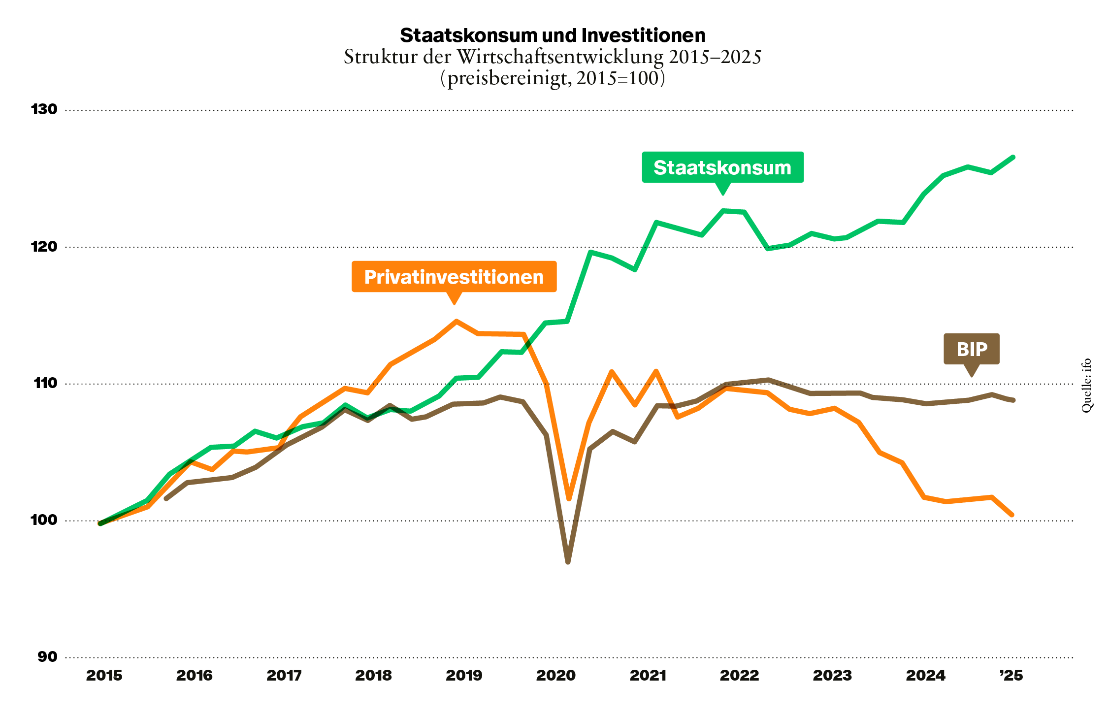 Ifo-Chef und Ökonom Clemens Fuest nimmt diese Grafik wie viele andere Kommentatoren auch als Warnung vor einem »dramatischen Niedergang« der deutschen Wirtschaft – und fordert große Sozialreformen sowie Bürokratieabbau. Auch der Kanzler sieht in der Grafik eine simple Ursache-Wirkungs-Story: Der Staat gebe zu viel aus, der Privatsektor werde verdrängt, und deshalb investiere niemand mehr.