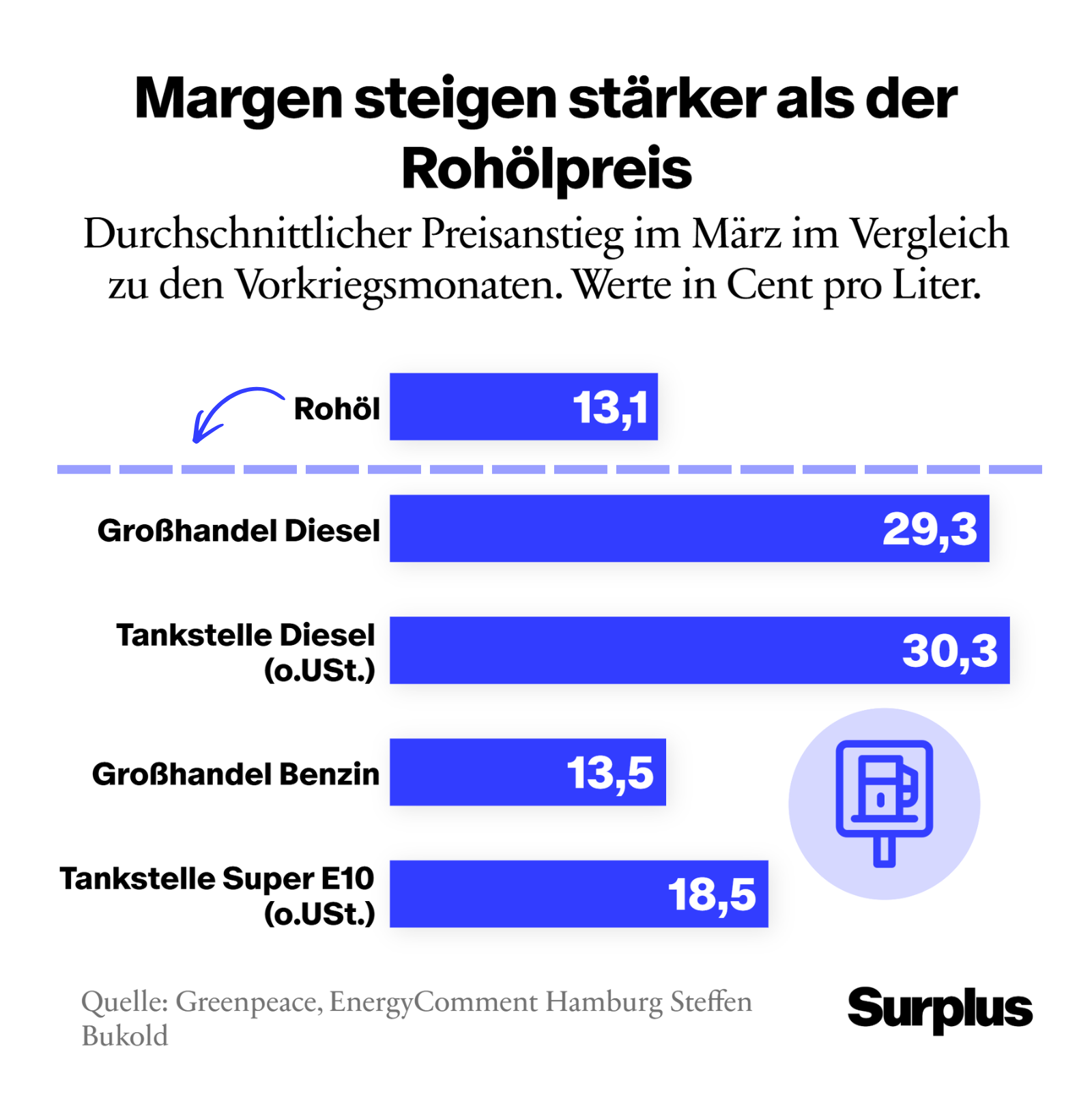 Der ADAC wirft den Konzernen Preistreiberei vor. Die Greenpeace-Studie zeigt, dass sie profitieren: Seit Beginn des Iran-Kriegs wurden bei Benzin zusätzliche 3,2 Millionen Euro pro Tag und bei Diesel sogar 17,9 Millionen Euro verdient.