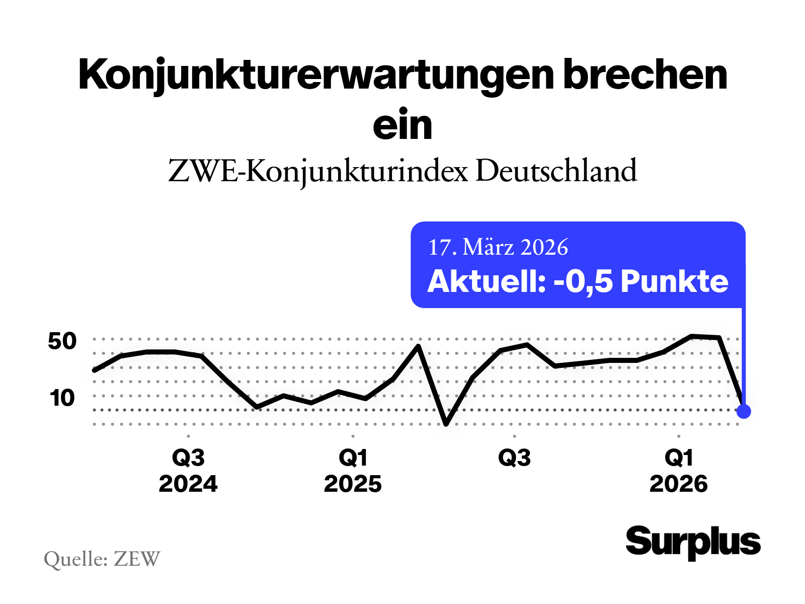 Bei Finanzexperten wachsen die Sorgen, dass der Krieg im Nahen Osten die erwartete Erholung der deutschen Wirtschaft verzögert. Die ZEW-Konjunkturerwartungen brachen im März um 58,8 Punkte zum Vormonat auf minus 0,5 Punkte ein, wie das Mannheimer Zentrum für Europäische Wirtschaftsforschung mitteilte. Volkswirte hatten im Schnitt einen viel weniger deutlichen Rückgang auf plus 39,2 Punkte erwartet.